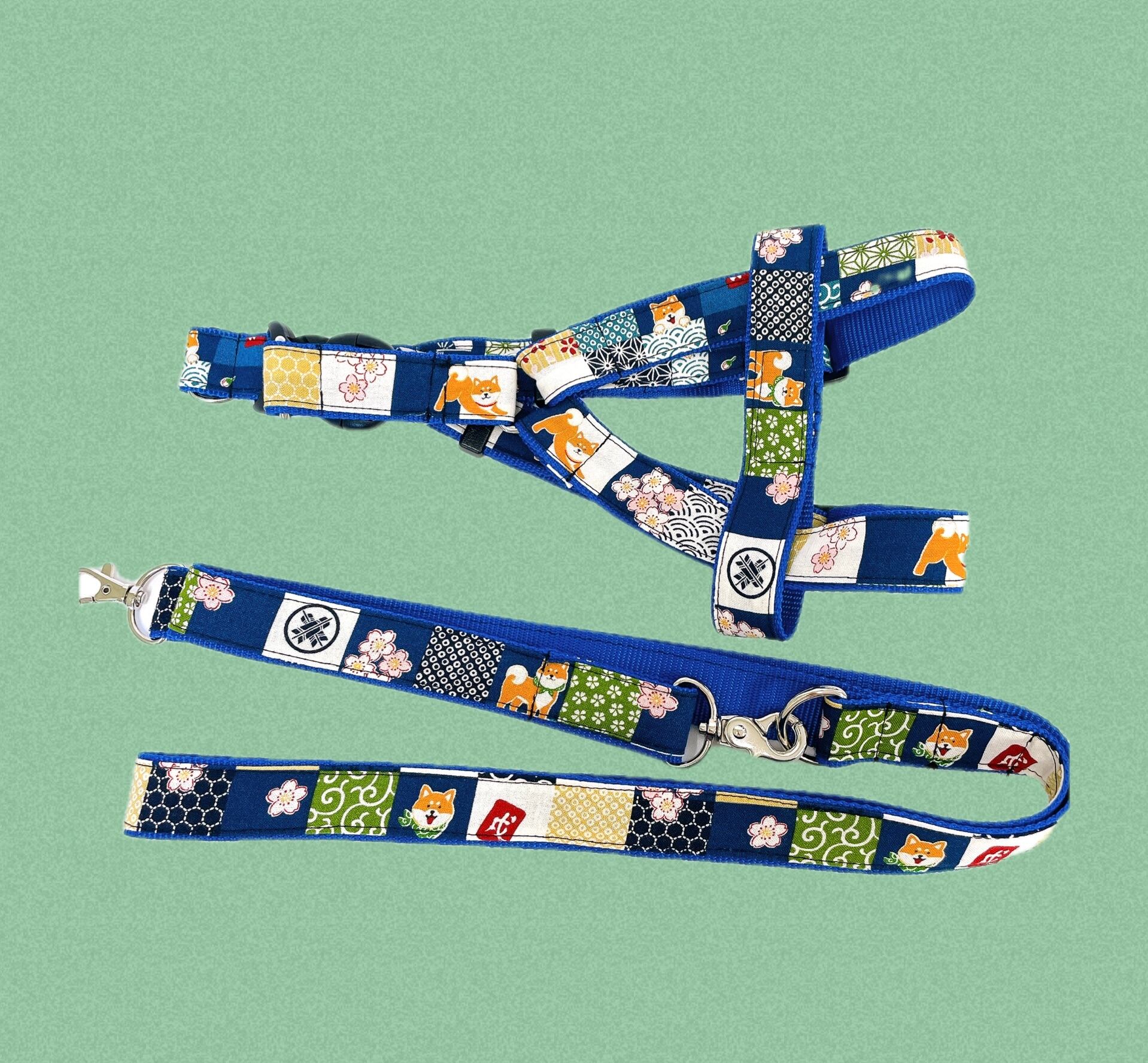 柴犬和柄ハーネス&リードセット青★フレンチブルドッグパグボストンテリア中型犬小型犬大型犬マクドナルドマックブヒ和風